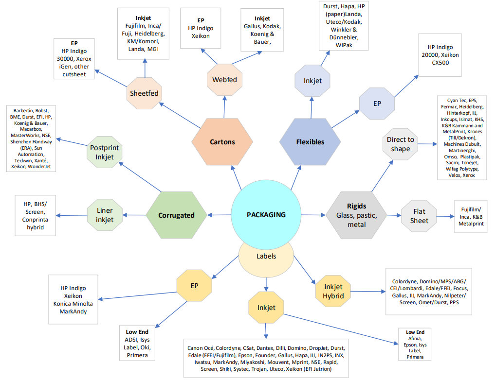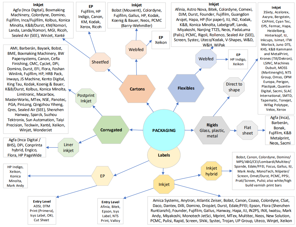 Well, the good news for us print techies is this diagram will get even more crowded this year. Smithers tracks the developments in this sector, publishing reports and running conferences on digitally printed packaging. The European, American and Asian events bring together hundreds of brands, retailers, packer/fillers, converters, agencies and designers together with equipment, substrate and ink/toner suppliers, with workflow and logistics companies also involved. These are excellent forums and over the years the discussion moved from technology issues into tangible benefits and improved business processes from adopting digital printing, and increasingly digital finishing.