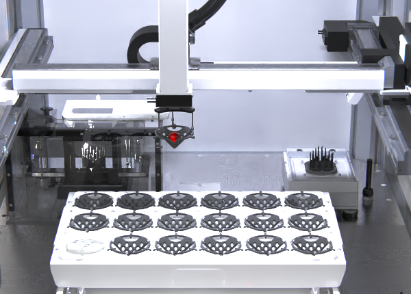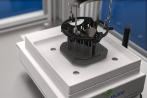 With this in mind, the most recent and disruptive density determination technology developed by Dimensionics Density effectively uses the Archimedes method but in combination with modern automation technology. The samples to be measured are placed in a special component carrier, which is provided with openings on the underside. These component carriers are transported through the system by an axis robot and thus lowered centrally and precisely onto the scales. On the scales themselves, a lift-out rack with pins is placed, which lifts the component over the openings in the component carrier and thus lifts the component out of the carrier.