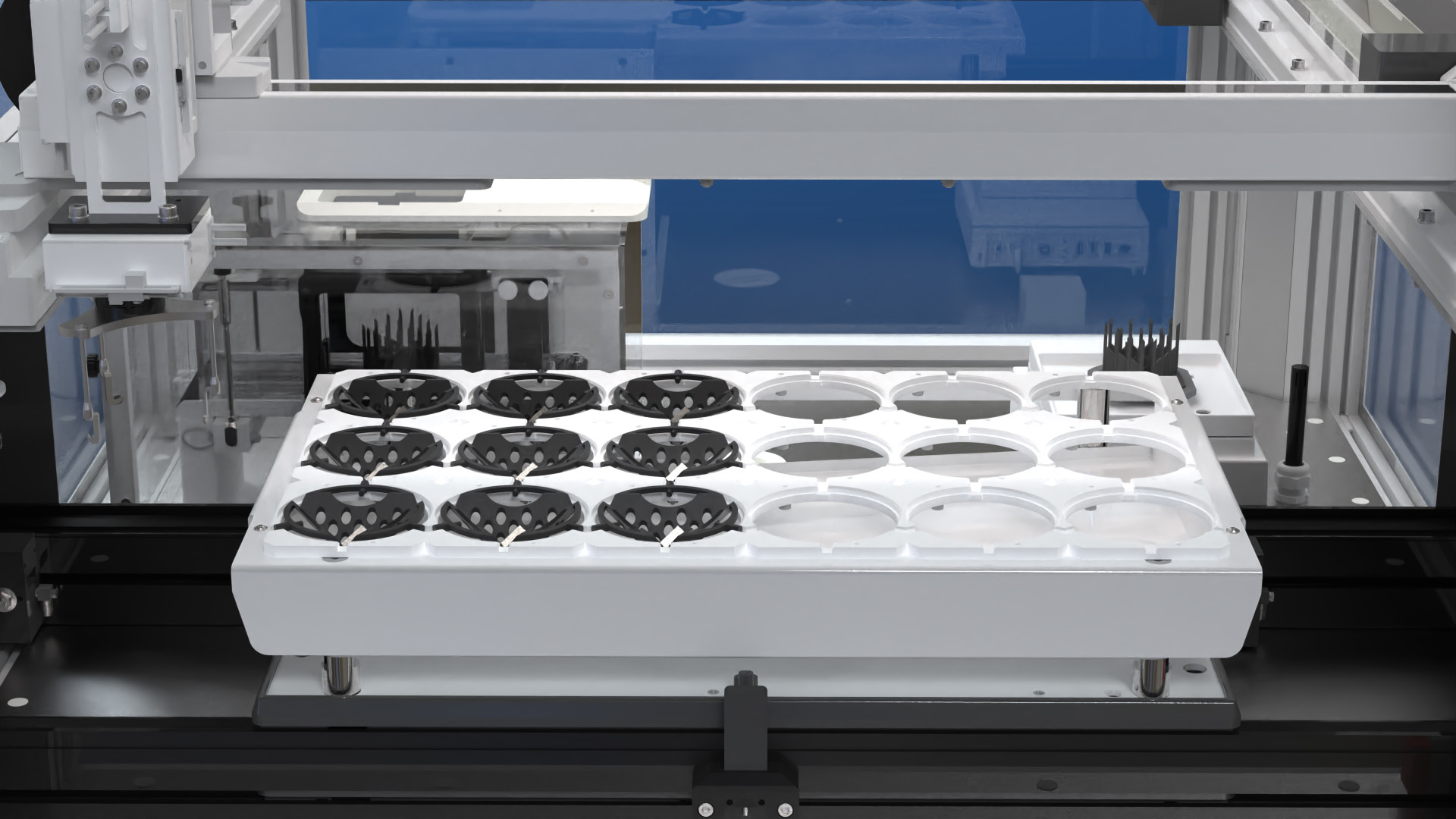 Dimensionics Density’s density determination technology elevates the classic Archimedes principle to new heights of precision, speed, and repeatability through the integration of advanced automation technology. The density determination process is meticulously designed for maximum accuracy. Samples are carefully placed within an innovatively crafted component carrier, featuring strategically positioned openings for measurement precision. These carriers glide through the system, guided by a robotic arm that ensures central and exact placement onto the vibration-insulated scales.